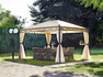 Gazebo OREGON – con pali Ø 72 mm in ferro epoxy antracite – poliestere resinato 210 gr. – altezza max. 2,74 mt – con antivento – copertura color sabbia – tende laterali e tende mosquito color ecrù