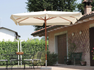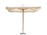 Ombrellone 3 x 3 mt. – serie standard – fusto legno Ø 48/8 in due pezzi – 2 doppie carrucole – bacchette 17 x 23 mm – altezza max. con base 2,71 mt – poliestere 180 gr. ecrù con volante e antivento
