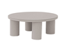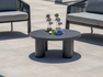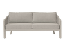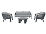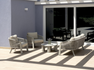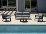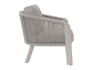 Set SANTA CRUZ , composto da due poltrone, un divano a 2 posti e un tavolino con piano in alluminio Ø80 cm – struttura in alluminio antracite e corda per esterni grigio scuro con cuscini sfoderabili grigio chiaro o struttura in alluminio creta e corda per esterni sabbia con cuscini sfoderabili ecru’.